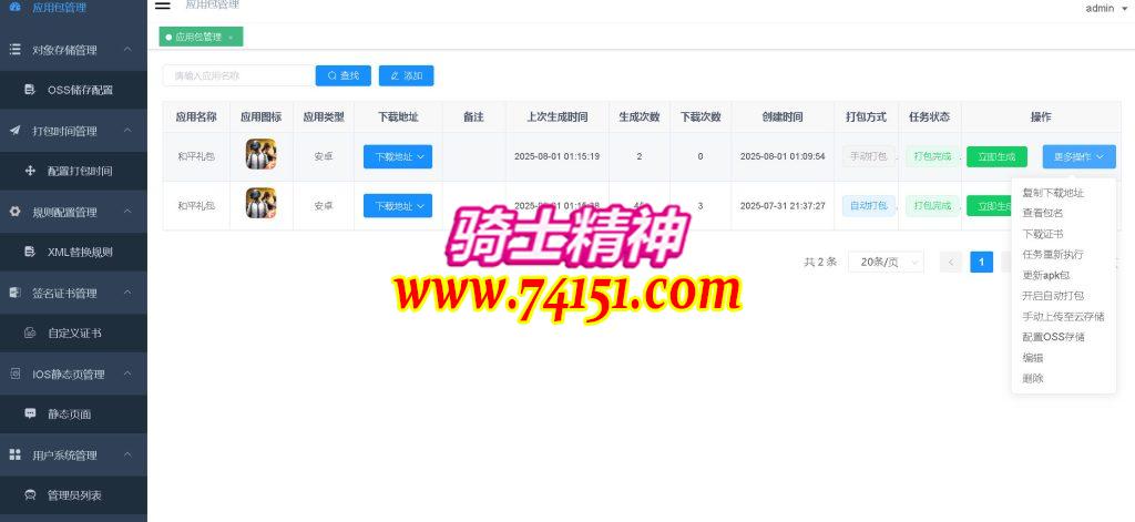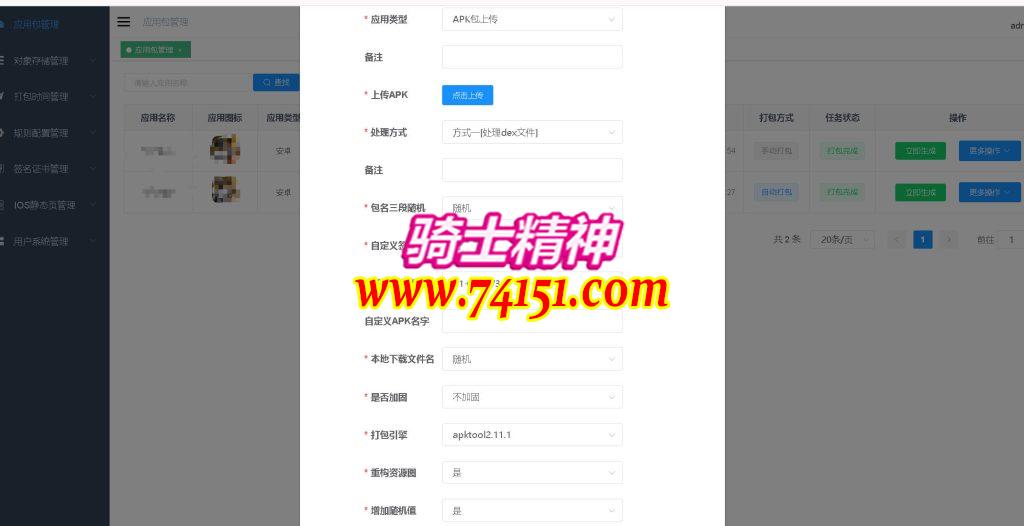 更新内容:1.支持网页转app功能,2.支持IOS网页免签封装,3.支持V1V2V3V4签名及12以上系统,4.支持APK处理时加固功能,5.新增后台客户端APP,6.新增IOS静态网页生成,7.优化OSS对象储存对接方法,8.优化打包逻辑及下载链接,9.重构程序后台美化UI,10.新增并编写一键环境部署工具,11.精简源码减少不必要的体积占用,12.详细部署教程【解说apk输出路径等注意事项】